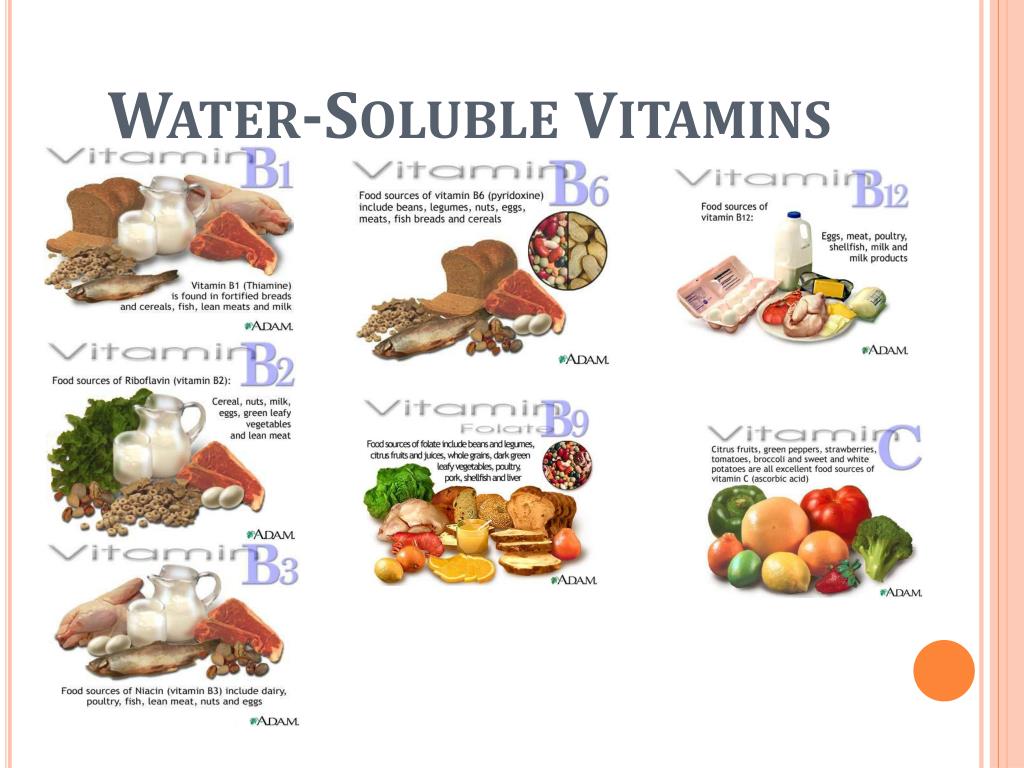 • Water soluble- i.e. variety of B vitamins and Vitamin C